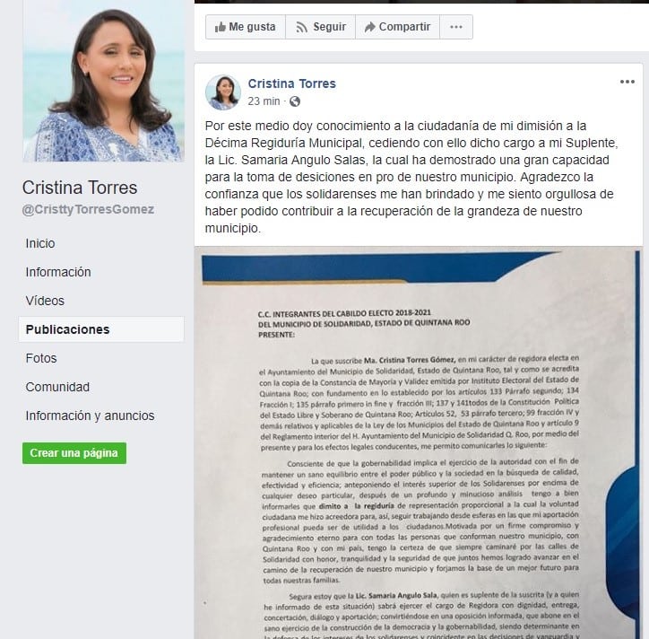 Playa del Carmen.- A través de las redes sociales, la aún presidenta municipal de Solidaridad, Cristina Torres Gómez, dimitió a su cargo como regidora en la siguiente administración.