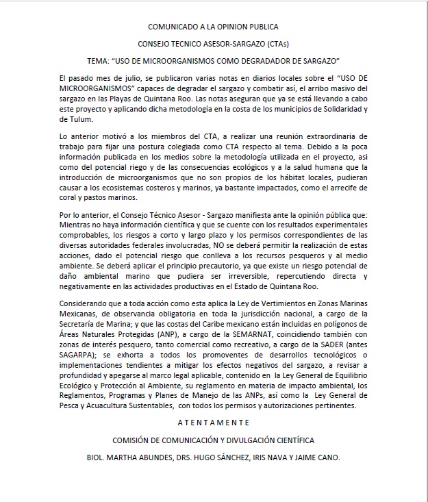 De acuerdo con CTA’s a través de un comunicado expliqcaron que, localizaron información en diversos medios locales sobre el uso de microorganismos que son capaces de degradar el sargazo, situación que aseguran no hay una metodología que explique cómo se hace y advierten del daño al ecosistema que esto puede generar.