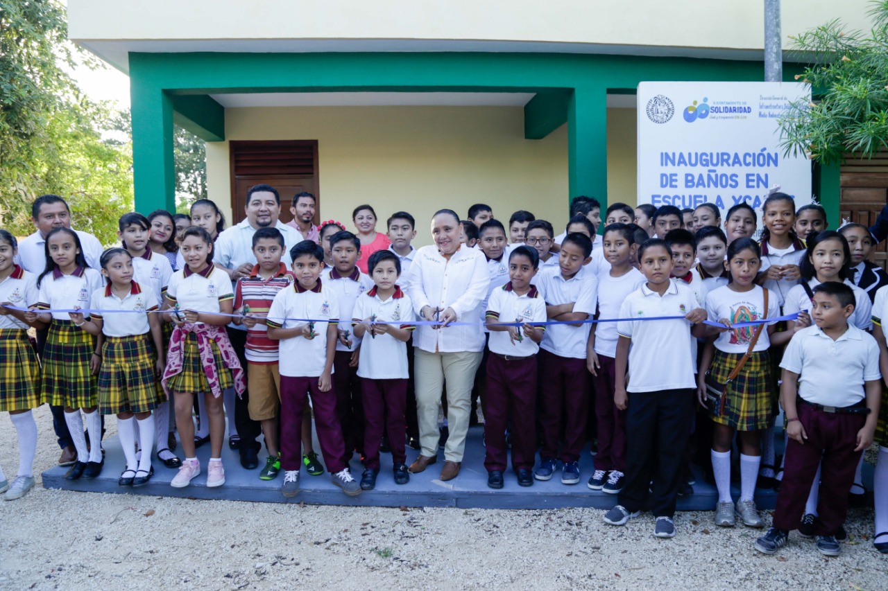 Playa del Carmen, Quintana Roo.-La Presidenta Municipal de Solidaridad, Cristina Torres Gómez, entregó instalaciones sanitarias en la Escuela Primaria “Xcaret” del fraccionamiento Villas del Sol, cumpliendo un compromiso más a los estudiantes.