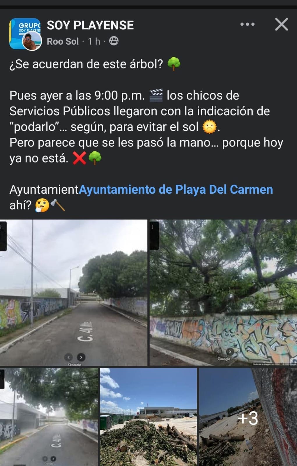 ¿Se acuerdan de este árbol? Pues ayer a las 9:00 pm, los chicos de Servicios Públicos llegaron con la indicación de ‘podarlo’, según, para evitar el sol. Pero parece que se les pasó la mano, porque hoy ya no está”, decía una publicación en Soy Playense, uno de los grupos más activos en Facebook y que es usado por la gente de Playa del Carmen para publicar sobre diversos temas que ocurren en el municipio.