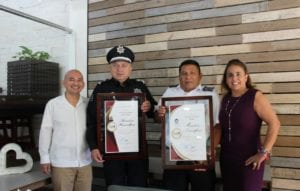 Solidaridad.- “Este reconocimiento representa la labor de todos los elementos que día a día dan muestra de su compromiso para brindar seguridad a los turistas y solidarenses”, señaló el director general de Seguridad Pública y Tránsito, Martín Estrada Sánchez, al recibir junto con el director de la Policía Turística, Alberto Pat Miss, una mención honorífica otorgada por el Centro Universitario Inglés.