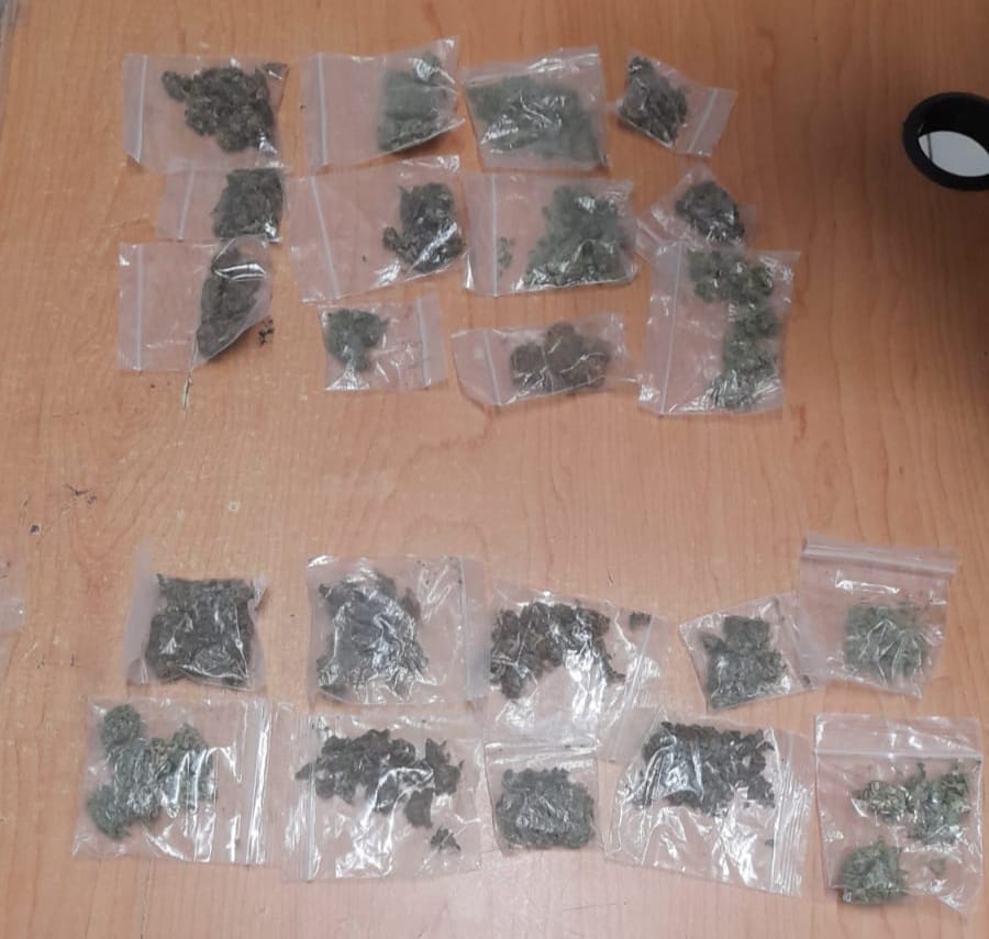 Al realizarles una inspección de seguridad se les encontró entre sus pertenencias 22 bolsas con vegetal verde similar a la marihuana y 1 bolsa con una sustancia granulada de las características de la droga llamada cristal, por lo que tras la lectura de sus derechos fueron trasladados a la corporación para ser valorados por el médico y puestos a disposición de la Fiscalía General del Estado por la posible comisión de delitos contra la salud.