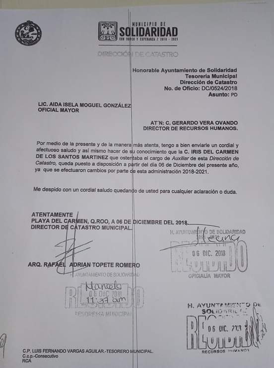 En el oficio, dirigido a Aida Isela Miguel (Oficial Mayor) y Gerardo Vera Ovando (director de Recursos Humanos), Topete Romero indica que Iris del Carmen “ostentaba” el cargo de auxiliar en la dirección antes mencionada.