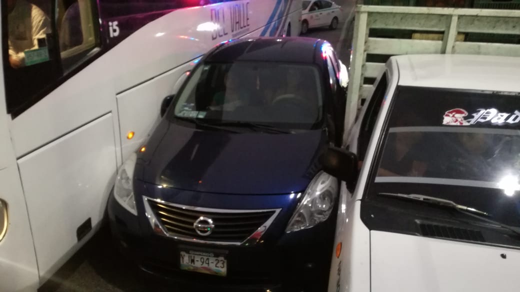 Playa del Carmen.- Una mujer que conducía un vehículo Nissan bajo los influjos del alcohol quiso pasar entre una camioneta Estaquitas y un autobús blanco, quedando atorada.