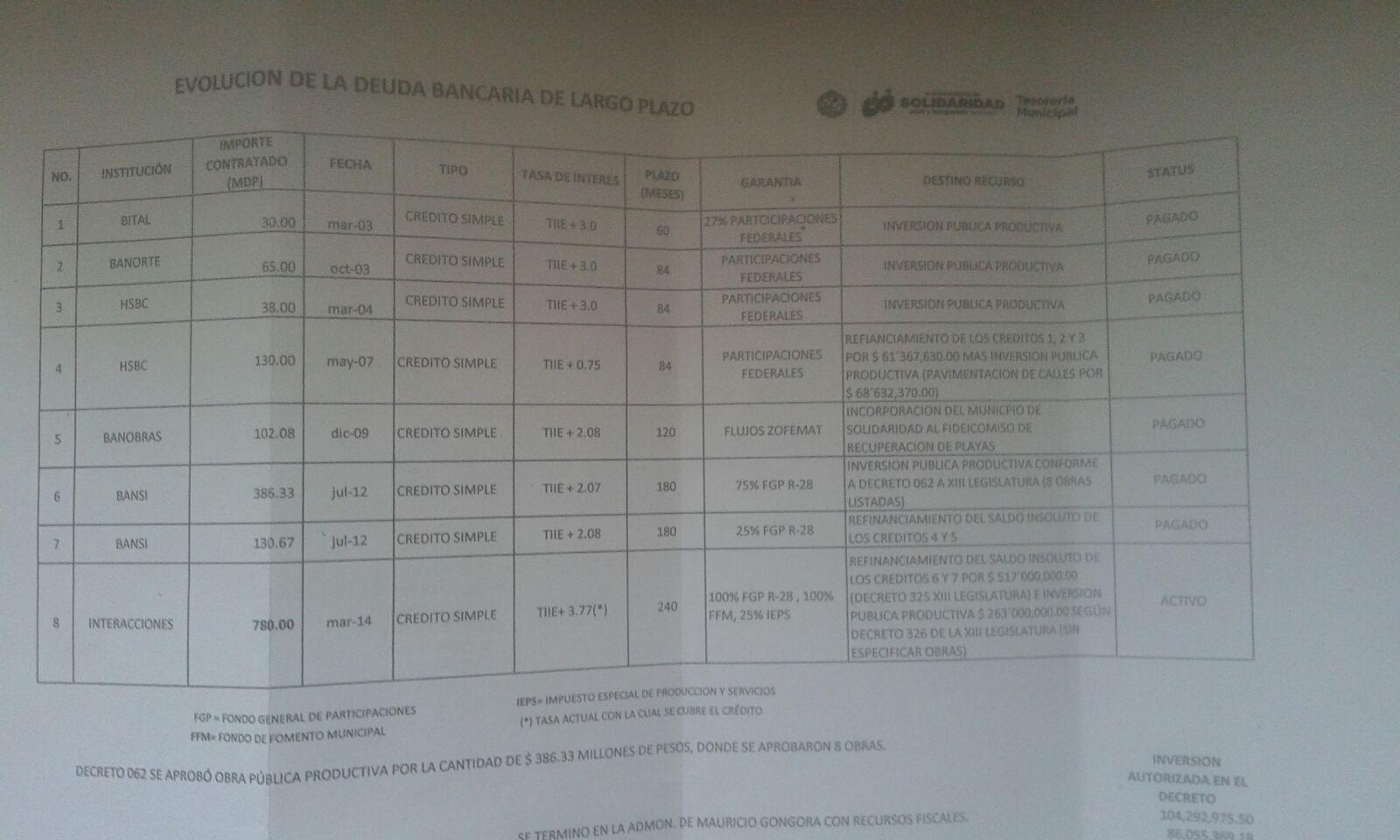 La cronología de la deuda municipal comenzó en el trienio de Gabriel Mendicuti Loría, exalcalde de Solidaridad quien solicitó el primero préstamo financiero de la época.