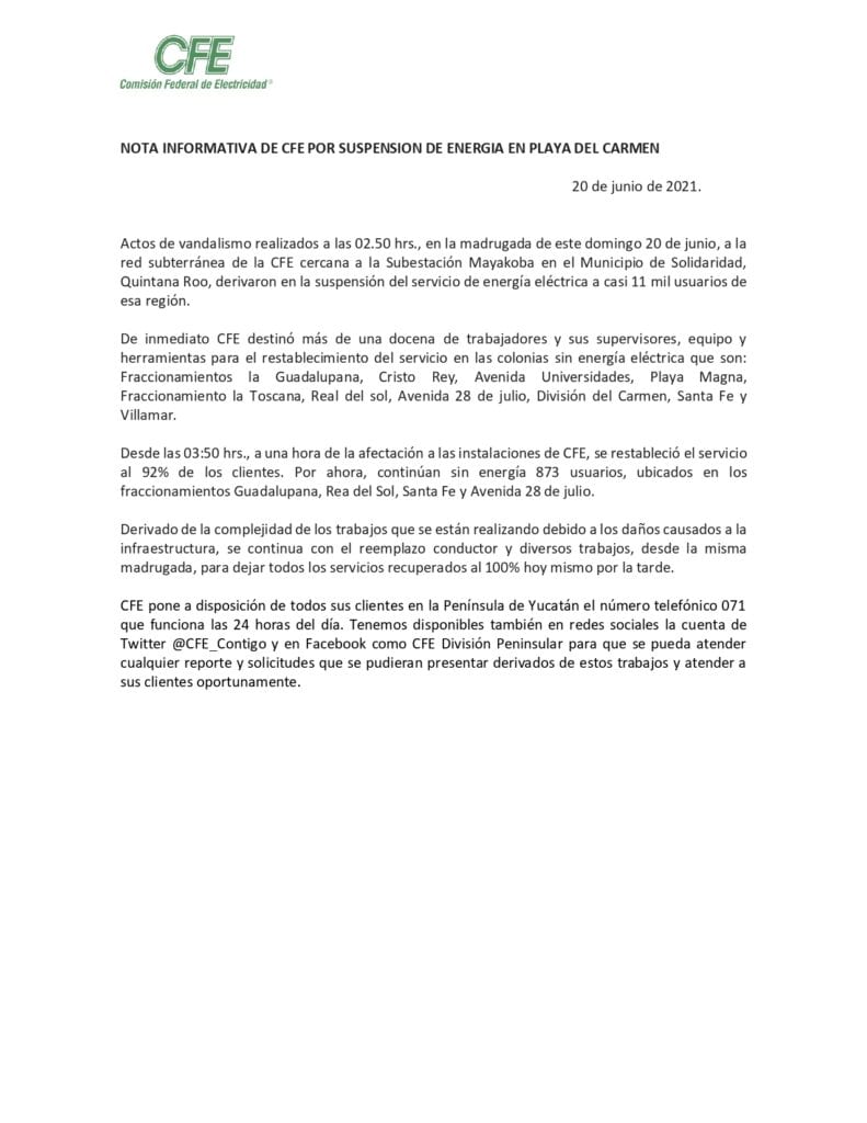 “Actos de vandalismo realizados a las 2:50 horas de la madrugada de este domingo 20 de junio, a la red subterránea de la CFE cercana a la Subestación Mayakoba en el Muncipio de Solidaridad derivaron en la suspensión del servicio a casi 11 mil usuarios”, señala la CFE.
