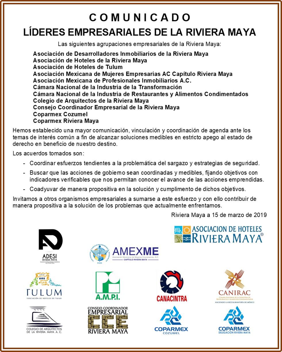 Participaron en esta reunión los capítulos de Riviera Maya y Cozumel de la Coparmex, las Asociaciones de Hoteles de la Riviera Maya y de Tulum, el Consejo Coordinador Empresarial de la Riviera Maya, la Asociación Mexicana de Profesionales Inmobiliarios (Ampi), los Colegios de Arquitectos e Ingenieros, Canacintra, Canirac y la Asociación Mexicana de Mujeres Empresarias, capítulo Riviera Maya.