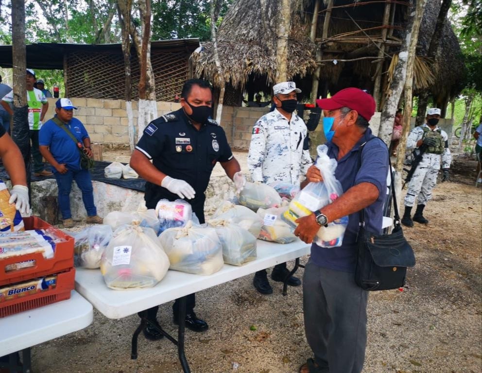 Solidaridad, Quintana Roo.-Conscientes de la situación económica que enfrentan familias vulnerables en los sectores más alejados del municipio por la contingencia del Covid-19, elementos de la Secretaría de Seguridad Pública y Tránsito Municipal encabezados por el comandante Jorge Robles Aguilar, este sábado hicieron entrega de despensas en la comunidad Los Faisanes, donde los habitantes agradecieron la labor de los oficiales.