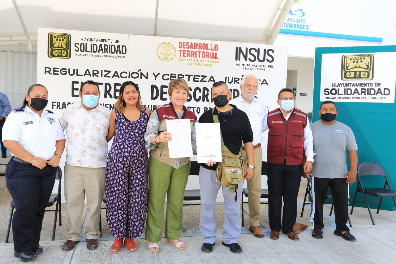 En el acto de entrega de títulos de propiedad, estuvieron el secretario general del Ayuntamiento, Alfredo Paz Cetina; el enlace municipal de Solidaridad, Alondra Jazmín Pineda Rumbo; y Andrés Ramos Jiménez, enlace en Playa del Carmen del Instituto Nacional del Suelo Sustentable (INSUS).