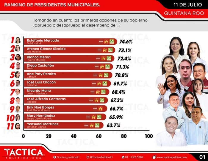 Según los números del ejercicio de Táctica Política, Estefanía Mercado cuenta con un 74.6 por ciento de aprobación ciudadana, y es seguida por las alcaldesas de Isla Mujeres y Puerto Morelos, con 73.1 y 72.4, respectivamente.
