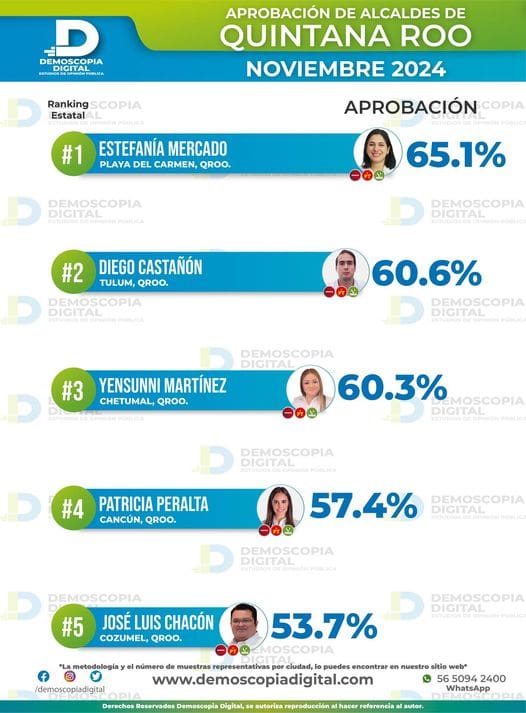 Estefanía Mercado Asencio se mantuvo como la mejor autoridad municipal en el estado de Quintana Roo durante el mes de noviembre del 2024, según el ranking de alcaldes que elabora de manera periódica la casa encuestadora Demoscopia Digital.