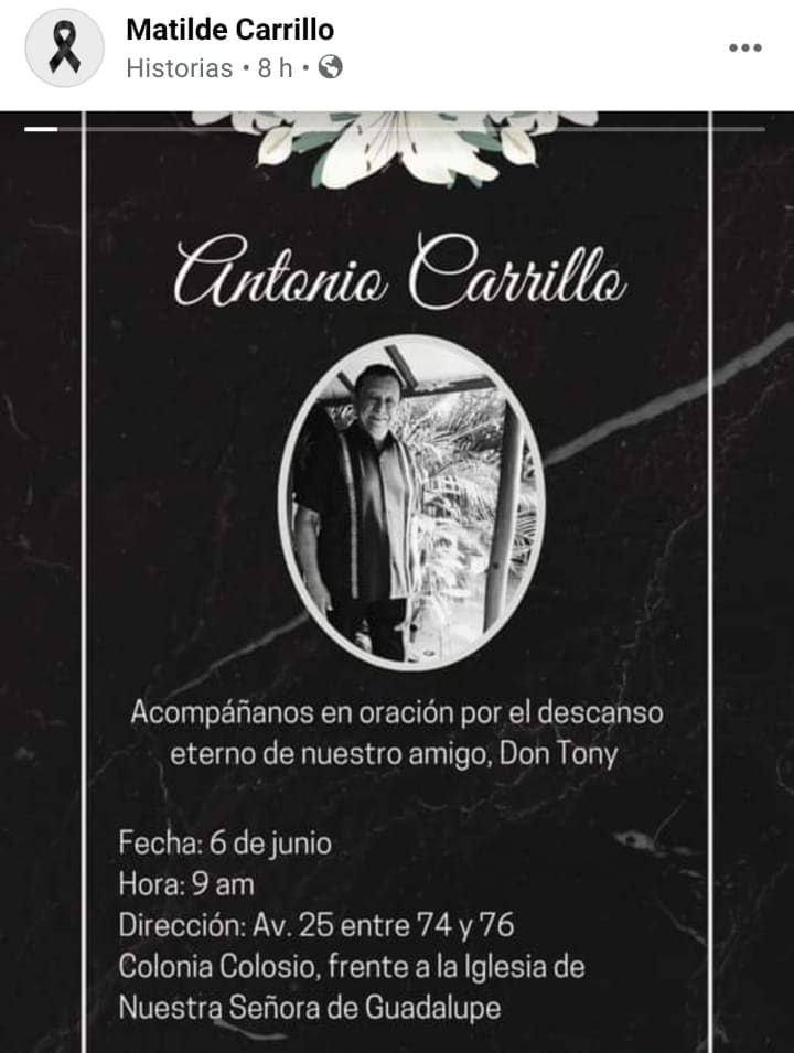 Las personas que deseen acudir a darle el último adiós a Antonio Carrillo, conocido cariñosamente como “Don Tony”, pueden hacerlo este 06 de junio en avenida 25 entre 74 y 76, en la colonia Colosio frente a la Iglesia Nuestra Señora de Guadalupe, según informó su hija Matilde a través de sus redes sociales.