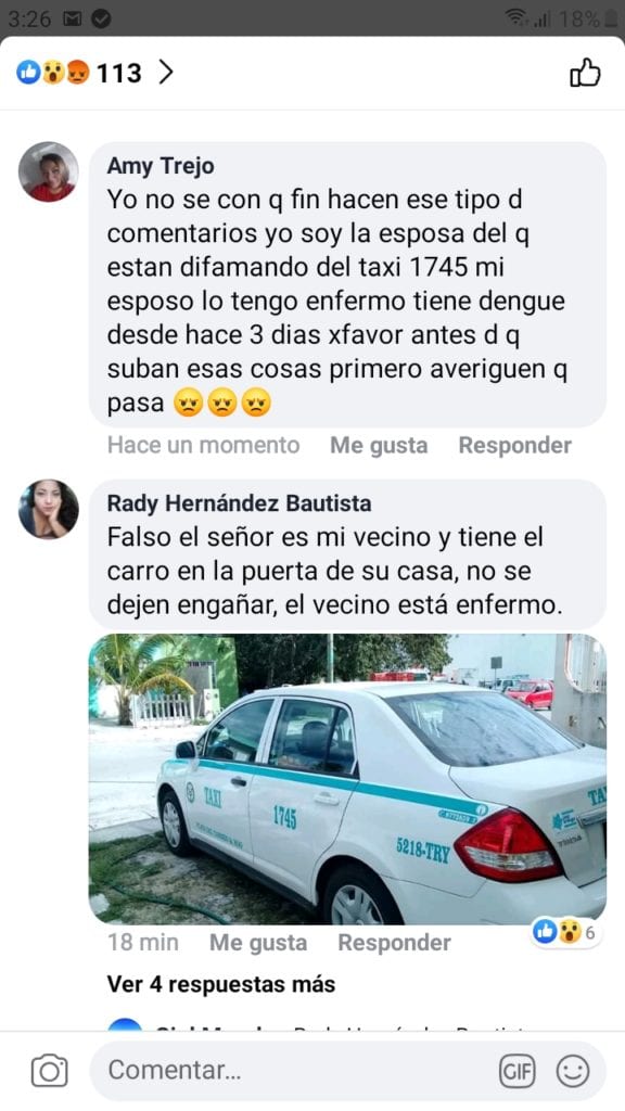 Incluso la esposa de éste ha comentado las publicaciones donde desmiente y asegura que el dueño y conductor de esta unidad se encuentra enfermo de dengue.