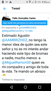 “No tengo la menor idea de quién sea este señor y no es mi interés andar haciendo este tipo de bromas a nadie, mucho menos a @MiguelRamonSII (Miguel Ramón Martín) quien es mi compadre y amigo de toda la vida”, expuso el senador.