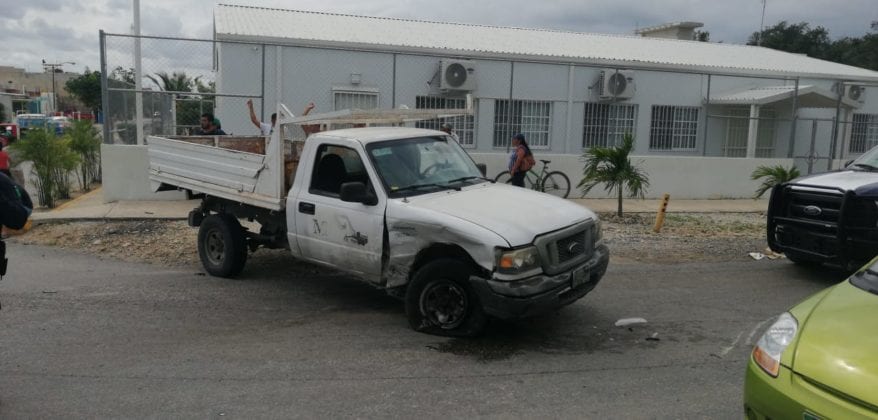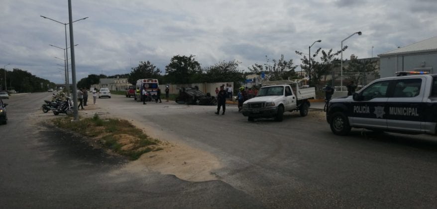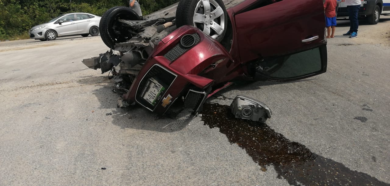 Playa del Carmen.- Una volcadura se registró la tarde de este sábado en el cruce de las calles Búho con Tintal de la colonia Villas del Carmen, donde una camioneta de placas de circulación CW-19-905 del estado de Campeche impactó a un vehículo Aveo rojo con saldo de un herido.