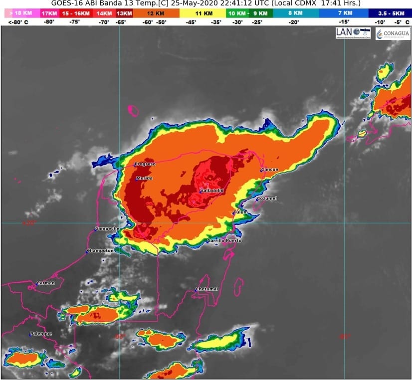 Advección de Aire Marítimo Tropical, con poco contenido de humedad procedente del Mar Caribe, lo que genera nubosidad variable, temperaturas muy calurosas, baja probabilidades de lluvias con algunos chubascos aislados ocasionales, sobre la Península de Yucatán y principalmente en la zona norte y centro del estado de Quintana Roo, por la tarde.