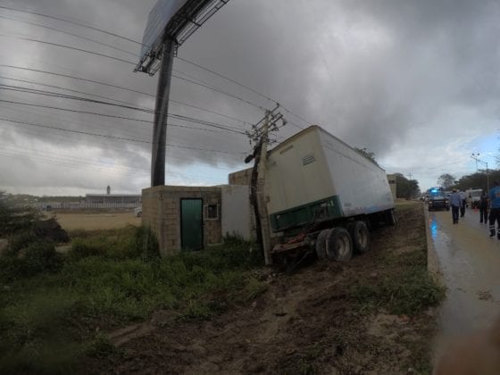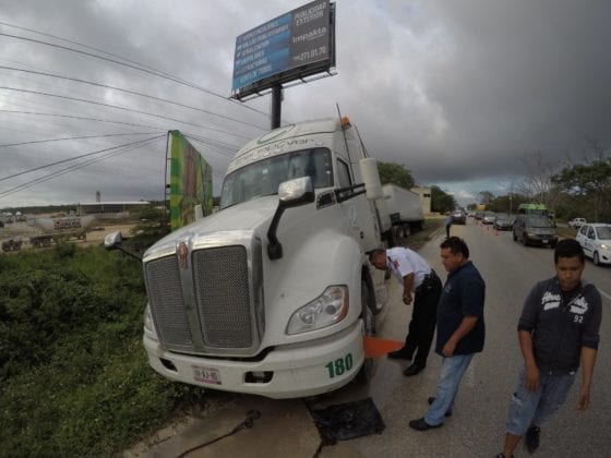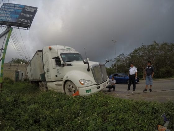Playa del Carmen.- Un tráiler de doble semirremolque se descarriló esta tarde a unos 30 metros del filtro en la entrada norte de esta ciudad.