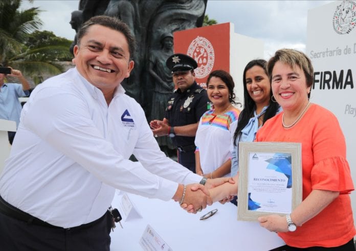 En ese marco, le entregó a la alcaldesa un reconocimiento por su impulso al Sistema de Apertura Rápida de Empresas (SARE), avanzando en la mejora regulatoria y le dio en mano un certificado de donación de una motocicleta para el Ayuntamiento de Solidaridad.