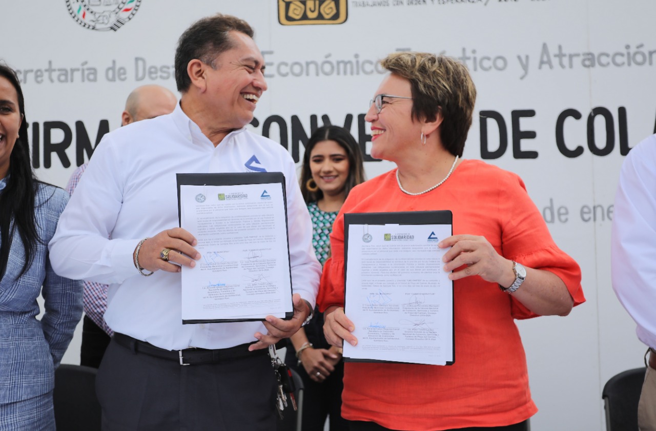 Playa del Carmen.- Con el objetivo de fomentar el desarrollo económico de Solidaridad y afianzar los vínculos de cooperación con el sector empresarial, la presidente municipal, Laura Beristain Navarrete, firmó un convenio de colaboración con la Cámara Nacional de Comercio, Servicios y Turismo (CANACO-SERVYTUR) de Playa del Carmen.