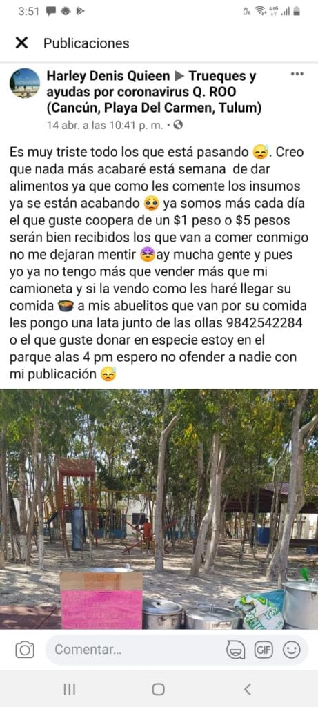 Aunque existen testimonios de que el DIF de Solidaridad, apoyó con donativos a Carla, o “Harley Denis Quieen”, la mujer insiste en decir que este comedor lo instaló ella sin ayuda. “No soy de ninguna institución de ninguna fundación yo empecé con mi dinero propio por qué vendí un vehículo y con $10,000 compre insumos y de Ai [sic] se fueron agregando más los que me apoyan con materia prima y otros con $ por qué están USA o otro lado del mundo cada peso que me dan se invierte bien y si fui la primero persona que se puso arepartir [sic] comida desde el 24 de marzo claro asta la fecha cómo todo se va acabando casa día me llega más y más gente y subí unas cosas mías para venderlas y seguir comprando me dijeron que me uniera a este grupo con el fin de que si pueden apoyen con lo que gusten dar”.