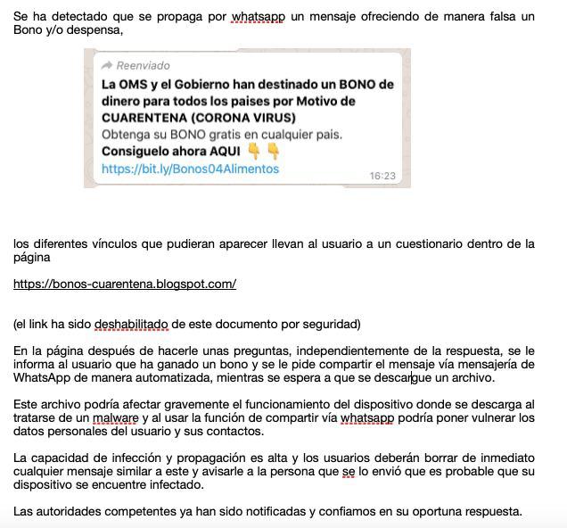 A través de las redes sociales y sobre todo por WhatsApp, internautas han advertido de la difusión de un virus malicioso que roba los datos de los usuarios, quienes inocentemente caen al ofrecerles bonos para amortiguar la economía durante la cuarentena.