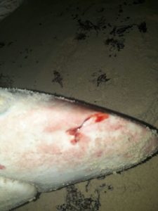 Playa del Carmen.- Un tiburón muerto fue hallado en la playa de Playacar fase 2 durante la madrugada, al parecer víctima de un arponazo en la cabeza.