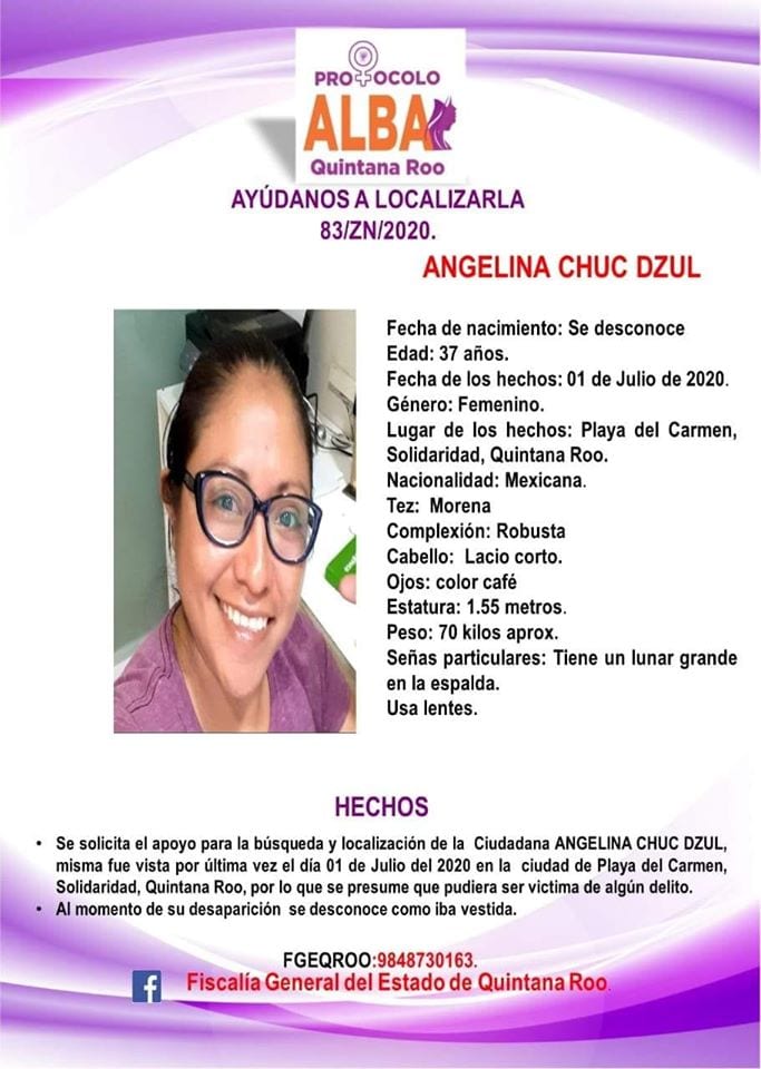 Por otro lado, se inició un protocolo de localización Alba para localizar a Angelina Chuc, quien tiene 37 años de edad, y cuenta con las siguientes características: