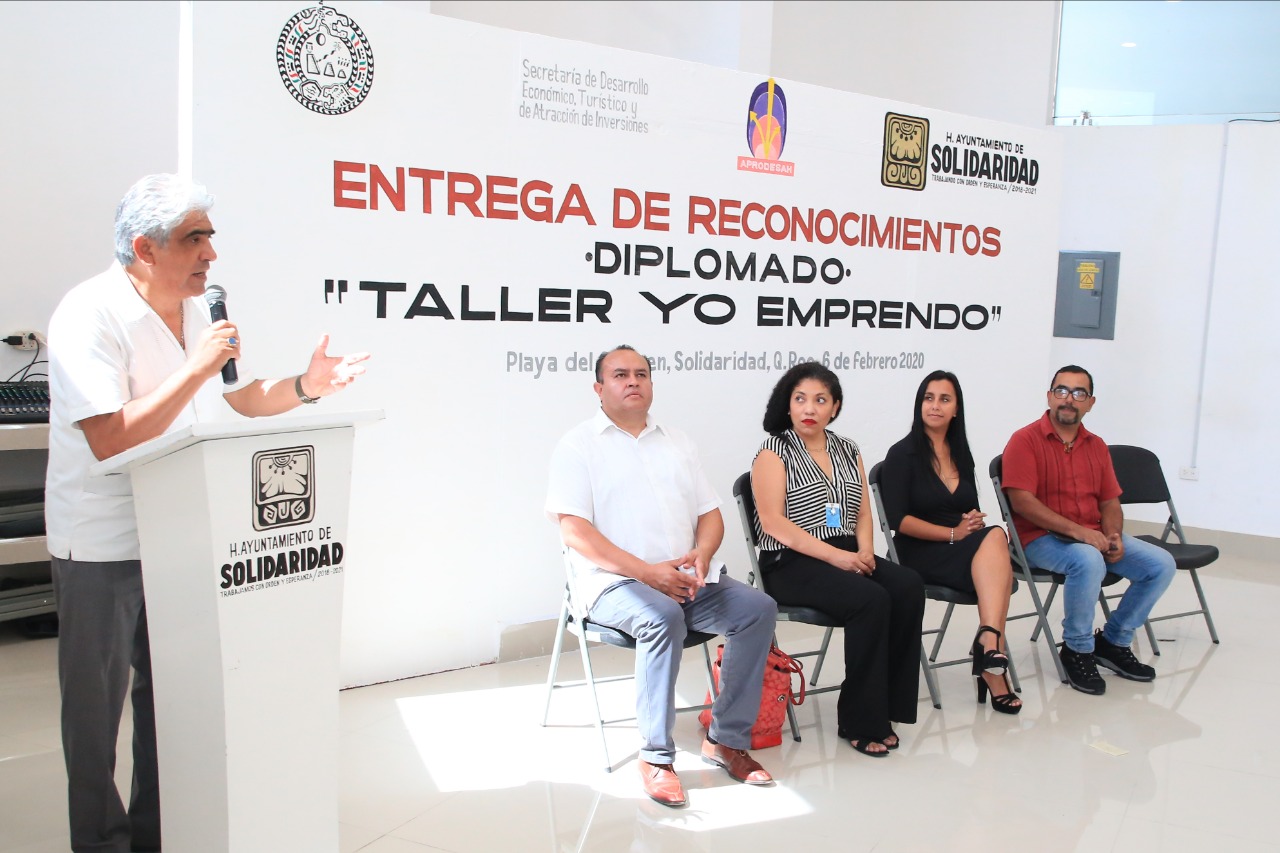 Playa del Carmen.- Como parte de los programas que se llevan a cabo para fortalecer a los emprendedores de Solidaridad, la Secretaría de Desarrollo Económico, Turístico y Atracción de Inversiones, continúa impulsando la economía local a través de la capacitación de 58 pequeños prestadores de servicios que recibieron este día un reconocimiento por su participación en el Diplomado “Taller Yo Emprendo”.