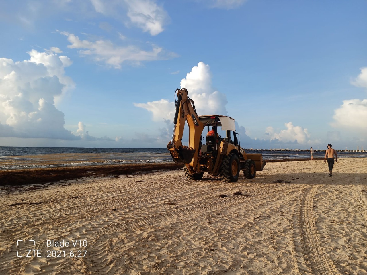 Playa del Carmen, Quintana Roo, a 27 de junio de 2021.- Diariamente, el gobierno de Solidaridad que dirige Laura Beristain Navarrete recolecta el mayor número de toneladas de sargazo que recala en la zona de playas, a través de los 120 trabajadores sargaceros y operadores de maquinaria contratados para esta labor.
