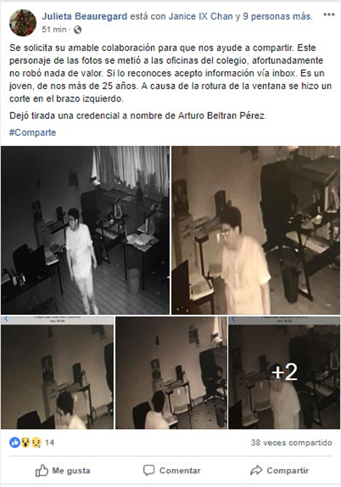 “Se solicita su amable colaboración para que nos ayude a compartir. Este personaje de las fotos se metió a las oficinas del colegio, afortunadamente no robó nada de valor. Si lo reconoces acepto información vía inbox. Es un joven, de nos más de 25 años. A causa de la rotura de la ventana se hizo un corte en el brazo izquierdo.