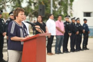 Acompañada por los regidores Elio Lara Morales y Verónica del Rocío Gallardo Herrera, del secretario general del Ayuntamiento, Alfredo Paz Cetina, así como por miembros de su gabinete, la munícipe agradeció a los elementos por su labor y los instó a redoblar esfuerzos para pacificar al municipio.