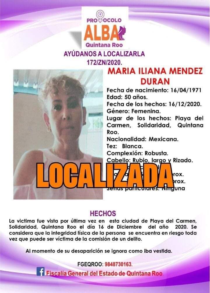 Playa del Carmen, Quintana Roo.-Tras casi un mes y medio de reportarse como desaparecida, María Iliana Méndez Durán, de 50 años de edad, fue localizada como reportó la Fiscalía General del Estado.