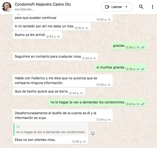 “Hable con Federico y me dice que no autoriza que se comparta ninguna información. Que de hecho quiere que se borre”. “Desafortunadamente el dueño de la cuenta es él y la información es suya”. “Los condóminos no son mis clientes”.
