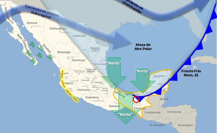 Informó que un sistema alta presión sigue impulsado masa de aire polar continental modificada sobre el Golfo de México, Península de Yucatán y Quintana Roo.