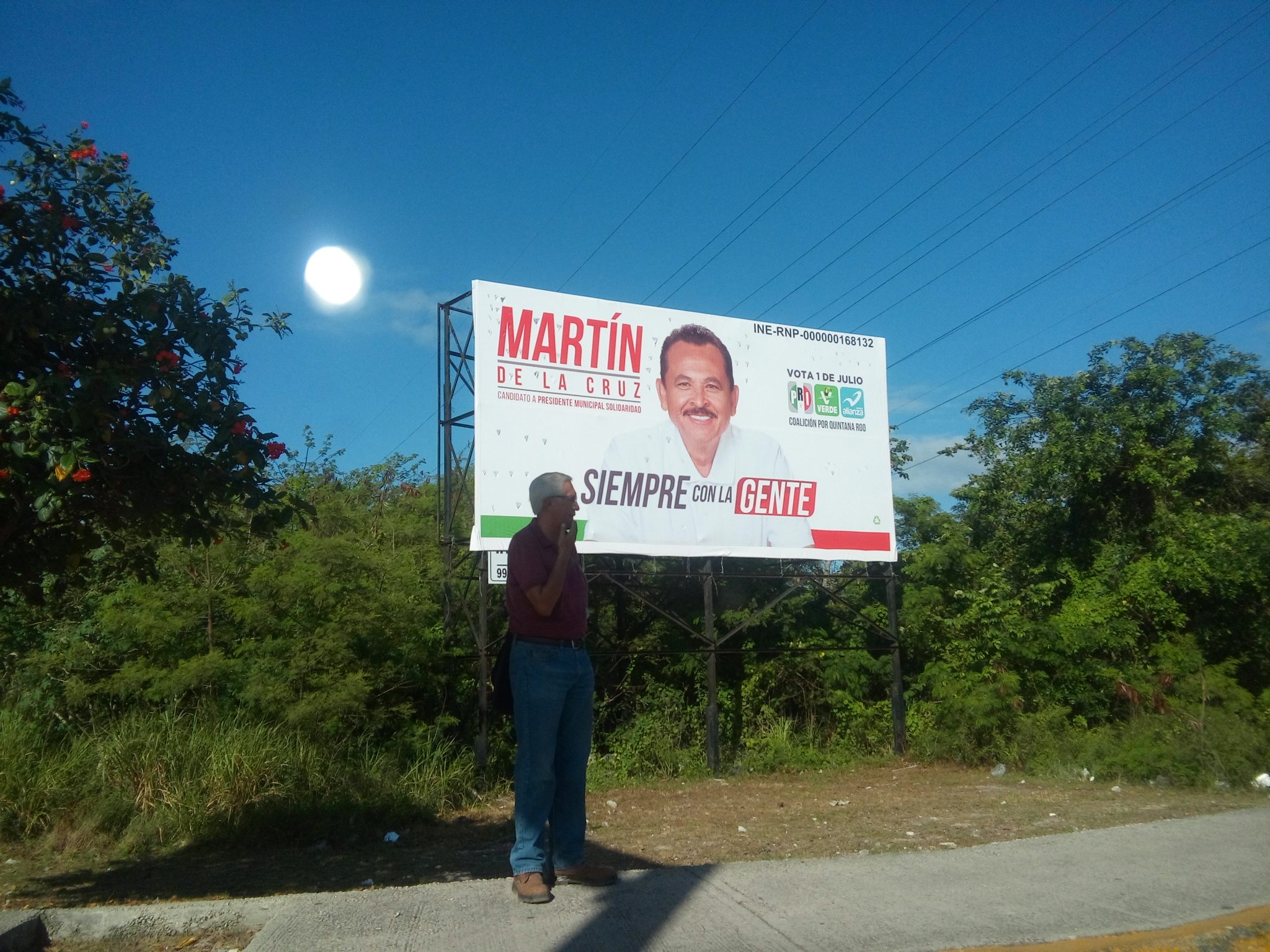 Playa del Carmen,Quintana Roo.-En un mes ha cambiado tres veces de anuncios espectaculares, como si cambiara de calcetines, el priista Martín de la Cruz, Candidato a la Presidencia Municipal de Solidaridad, por la alianza “Todos por Quintana Roo” , quien por su fuera poco ha colocado otro espectacular cuando afirmó antes que su campaña sería austera.
