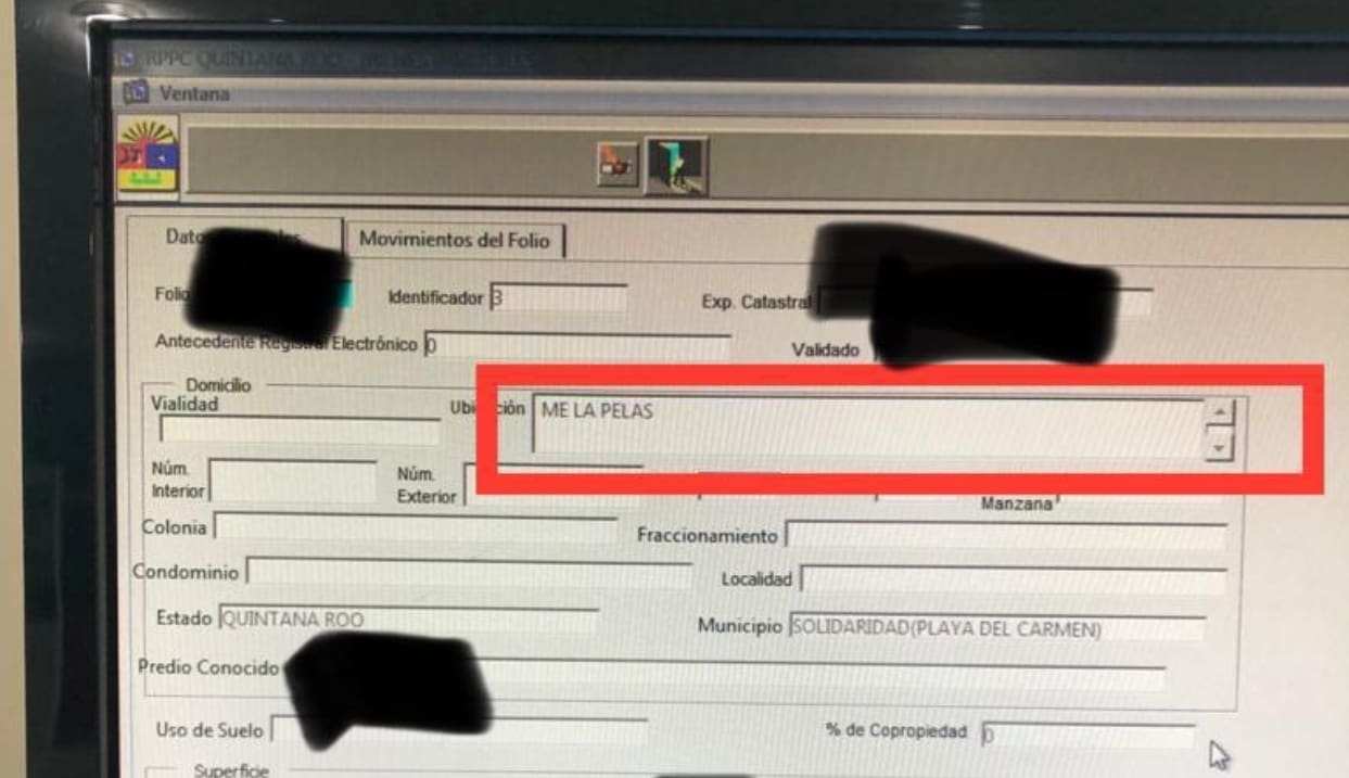 Playa del Carmen.- Exfuncionarios del Registro Público de la Propiedad (RPP) de esta ciudad, escribieron “Me la pelas” escribieron en el apartado “ubicación” del formulario digital de el título de su propiedad, tras negarse a ser extorsionado.