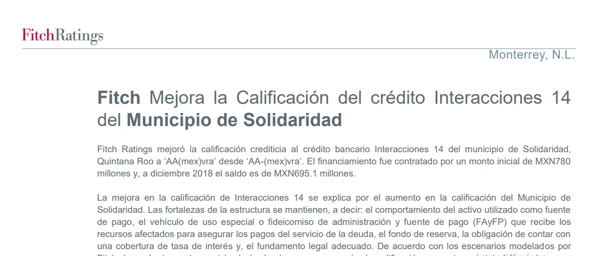 Playa del Carmen.- La mejora en la nota crediticia del Municipio de Solidaridad, así como a sus fuertes finanzas y comportamiento de pago hicieron que la empresa Fitch Ratings mejorara la calificación del crédito bancario Interacciones 14 contraído con este Ayuntamiento, pasando de AA-(mex)vra a la clasificación AA-(mex)vra.
