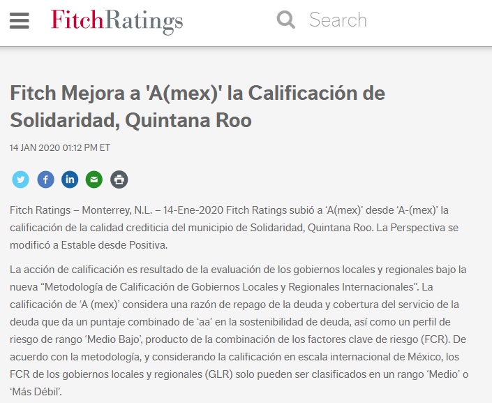 Playa del Carmen.- La consultora Fitch Ratings elevó la calificación crediticia de Solidaridad de A- (mex) a A (mex), por su fuerte crecimiento económico, sostenibilidad de la deuda pública y estabilidad financiera. Ello, a pesar de un adverso panorama nacional. Adicionalmente, también modificó a la alza la calificación del crédito bancario Interacciones 14, contraído por este ayuntamiento, de AA (mex)vra’ a AA+ (mex)vra.