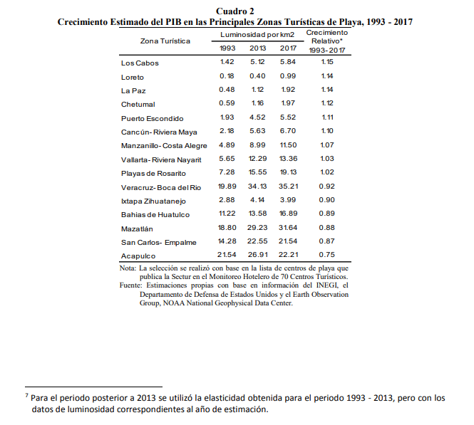 El estudio está “basado en fotografías satelitales de luz nocturna de la NASA y el Departamento de Defensa de los Estados Unidos, y usando la metodología propuesta por Henderson, Storeygard y Weil (2012)”, para medir el crecimiento económico de las principales 15 zonas turísticas de playa en México para el periodo 1993 al 2017”.