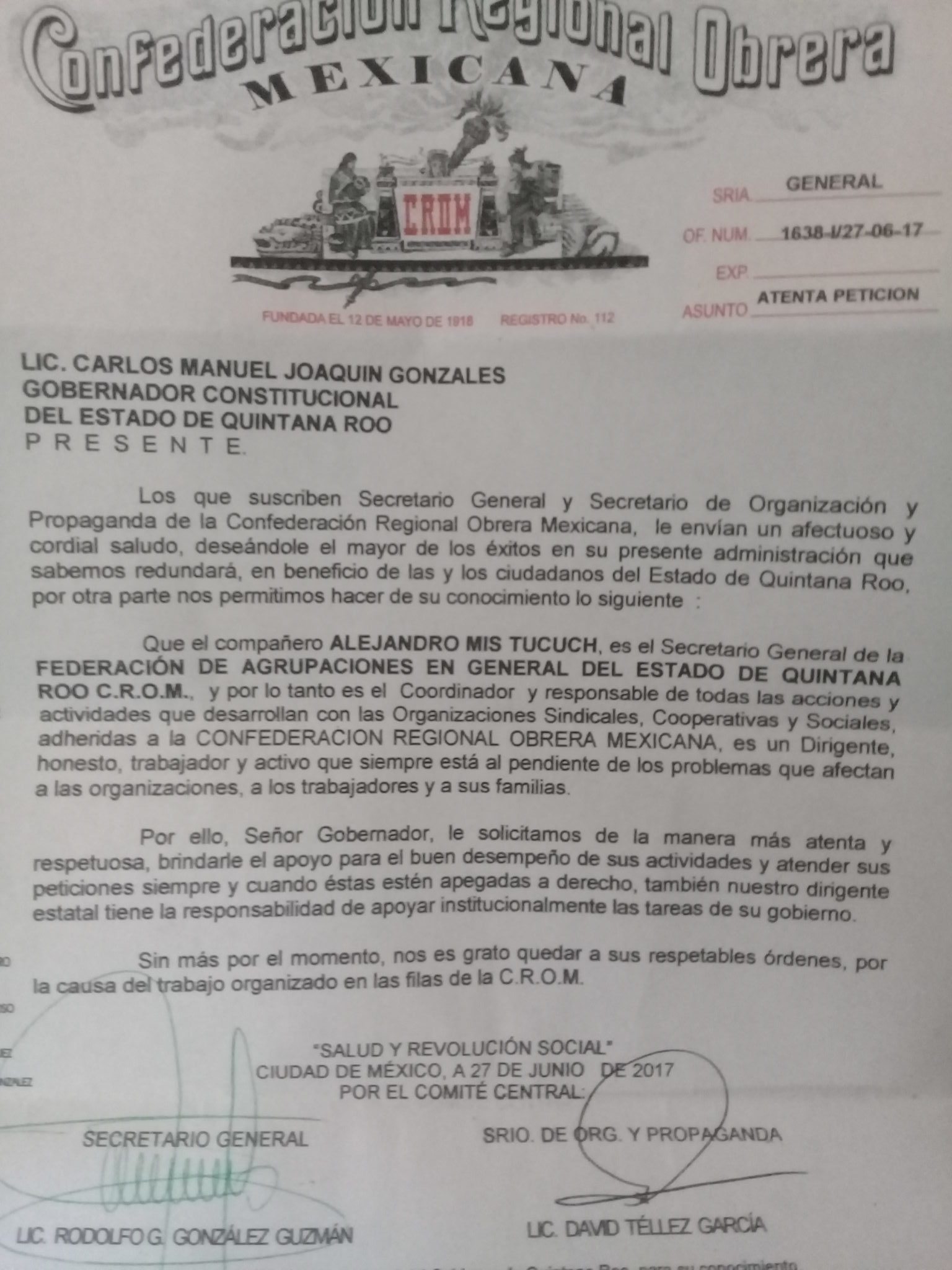En este sentido, Alejandro Mis presentó el oficio con número 1638-I/27-0617, en el que el secretario general del organismo, Rodolfo González Guzmán, lo ratifica como “coordinador y responsable de todas las acciones y actividades que desarrollan”.