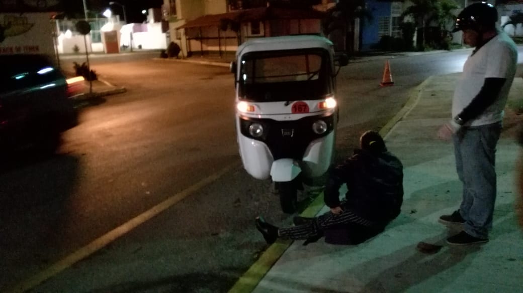 Playa del Carmen.- Una pasajera de un mototaxi se cae de esta unidad, que termina aplastándole la pierna, por falta de pericia del chofer, en el primer parque de Villas del Sol.
