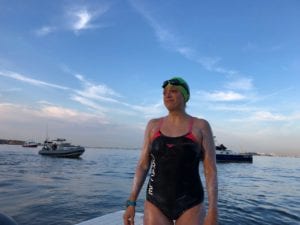 Ferguson terminó con éxito y estableció un récord mundial como la primera persona en nadar continuamente alrededor de toda la isla en una hazaña que le tomó 19 horas y 8 minutos para completar 63.5 kilómetros de nado.