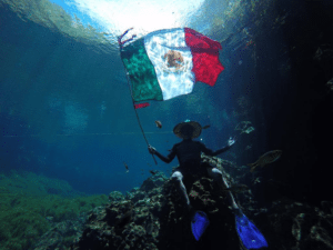 El segundo lugar lo obtuvo Einner Medina, con una imagen subacuática en un cenote. Un hombre con aletas, sentado en una piedra, detiene con su mano derecha una bandera mexicana. El lábaro patrio destaca entre los rayos del sol que atraviesan el agua, mientras peces tropicales nadan a su alrededor.