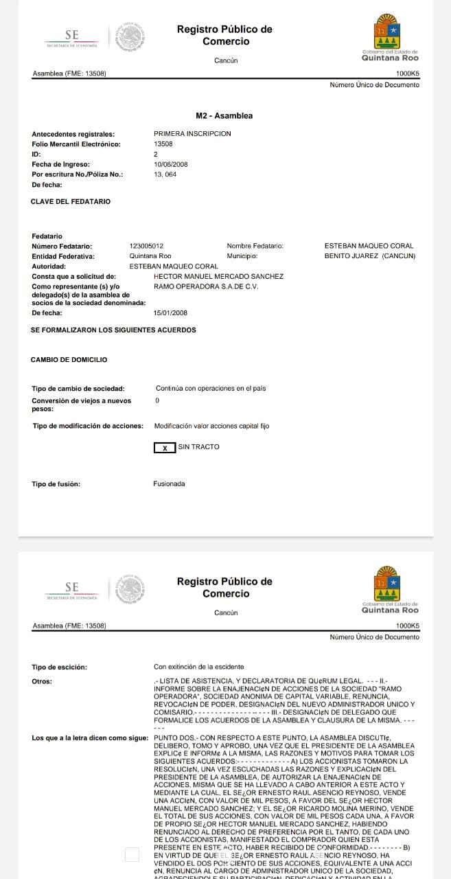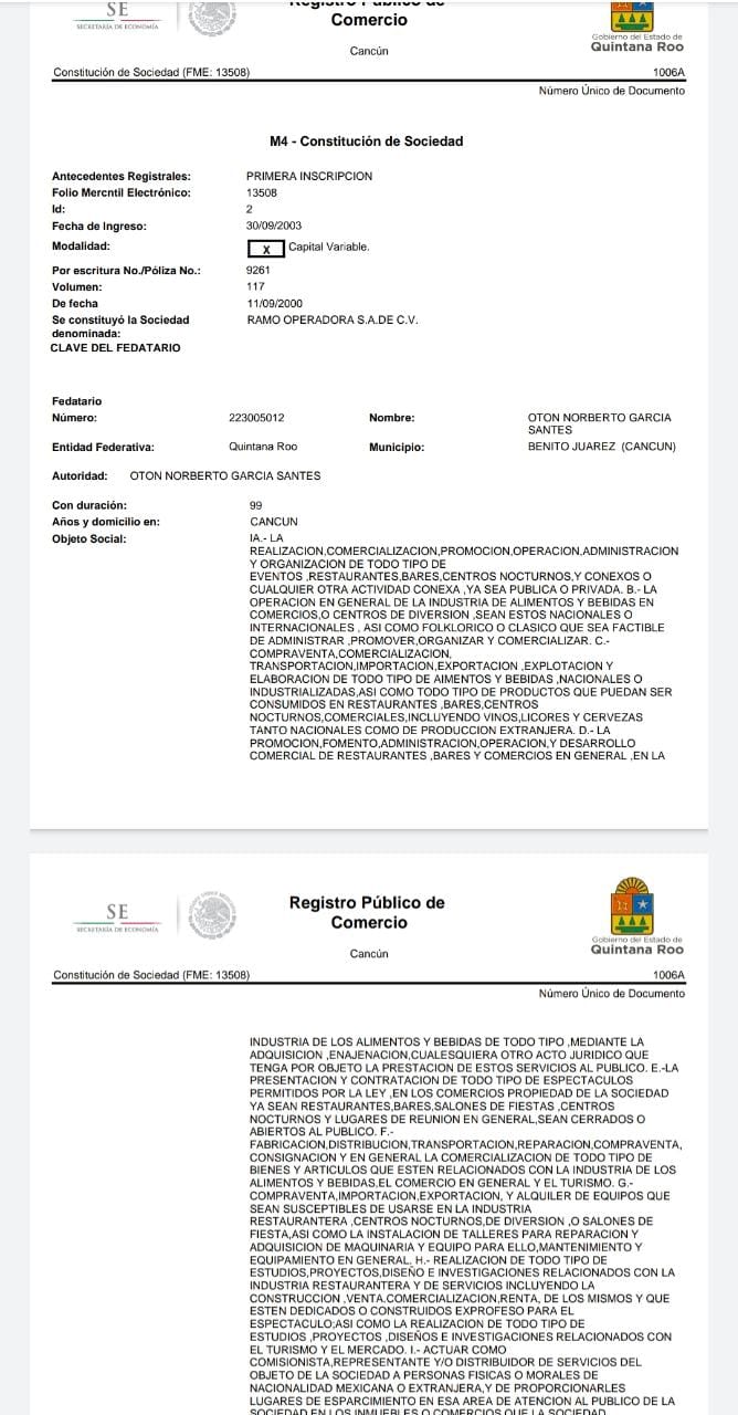 Quien solicitó el registro de la marca es Susana Guadalupe Fuentes Escamilla, quien aparece como representante legal de Ramo Operadora SA de CV, gracias a un poder que le fue otorgado por Héctor Manuel Mercado Sánchez, padre de la hoy candidata a diputada por la coalición Juntos Hacemos Historia en Quintana Roo.