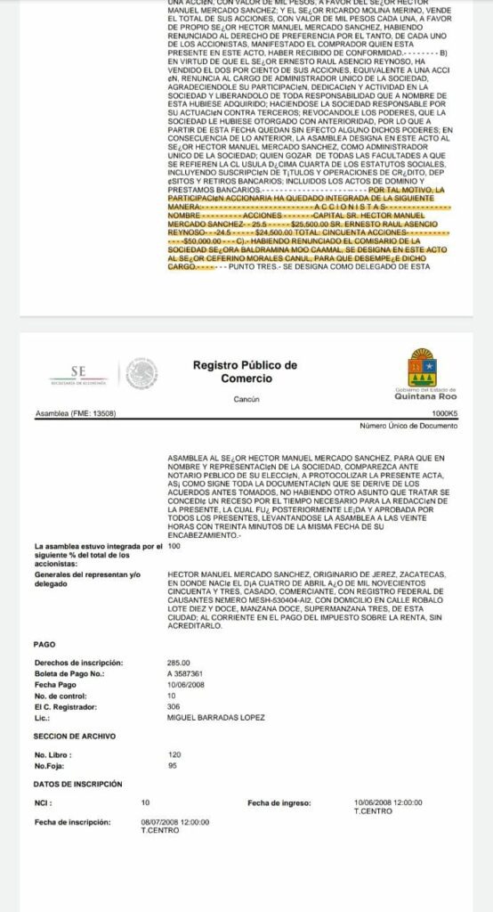 Esto significó que de manera formal Ricardo Medina Merino vendió el total de sus acciones a Héctor Manuel Mercado Sánchez, padre de Estefanía Mercado. Llama la atención que en este caso ambos son originarios de Zacatecas.