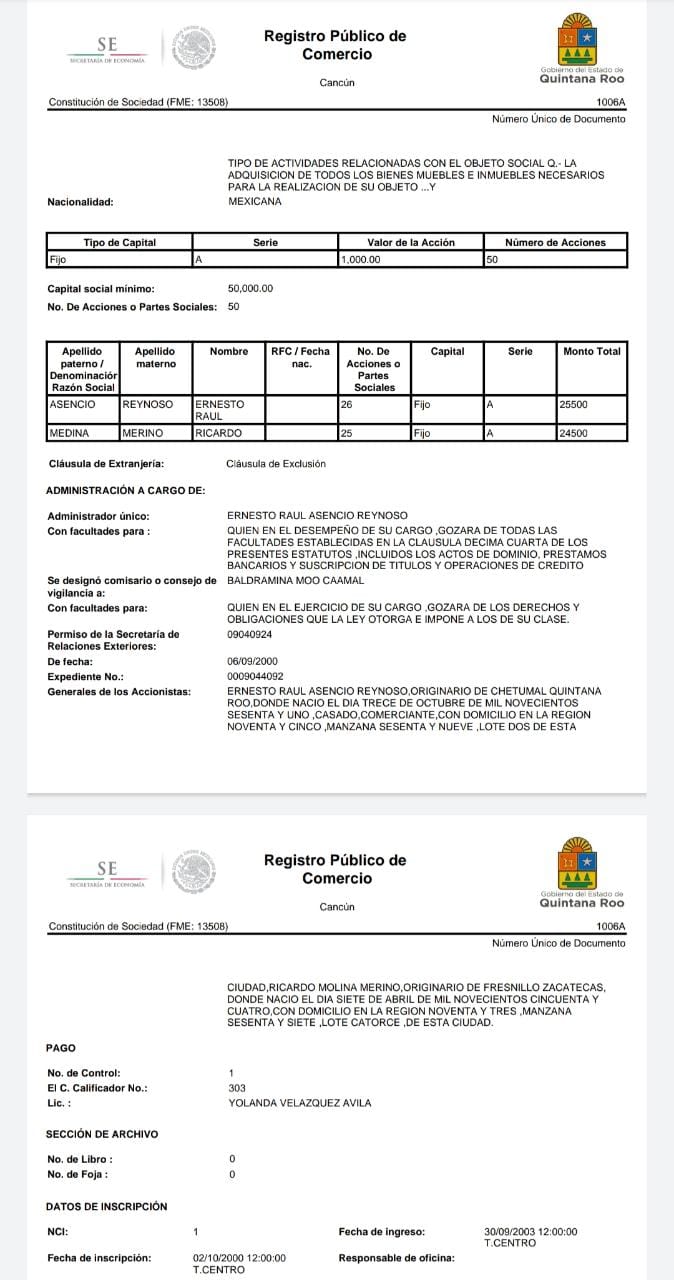 Como accionistas aparecían entonces Ernesto Raúl Asencio Reynoso, originario de Chetumal, Quintana Roo y de oficio comerciante; así como Ricardo Medina Merino, de Fresnillo, Zacatecas. Aunque cabe resaltar que Asencio Reynoso entonces ya también era funcionario de la Procuraduría estatal.