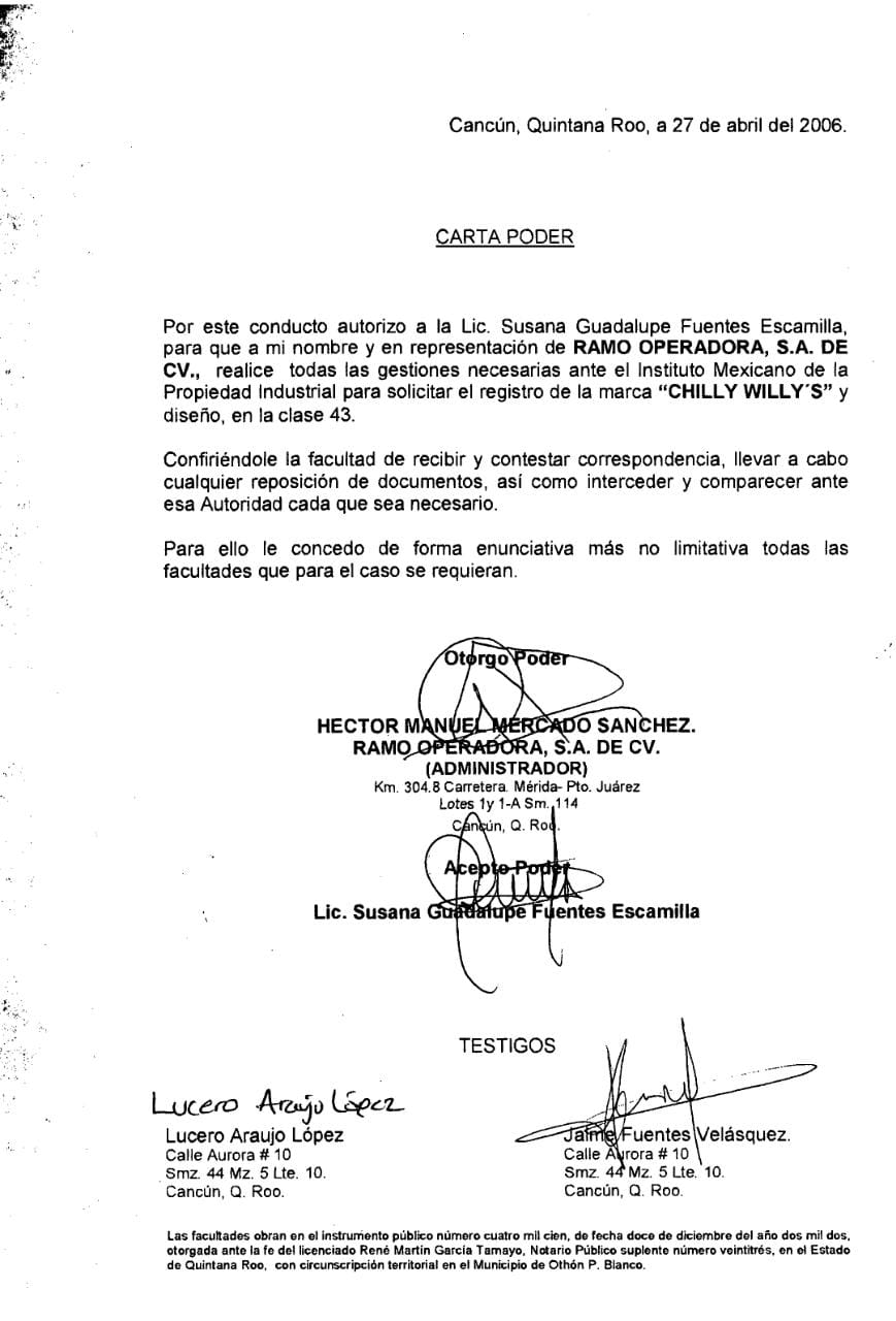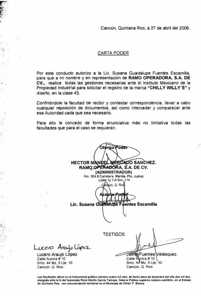 La carta poder que firmó Héctor Mercado como administrador de Ramo Operadora para pedir registro de marca Chilly Willy`s