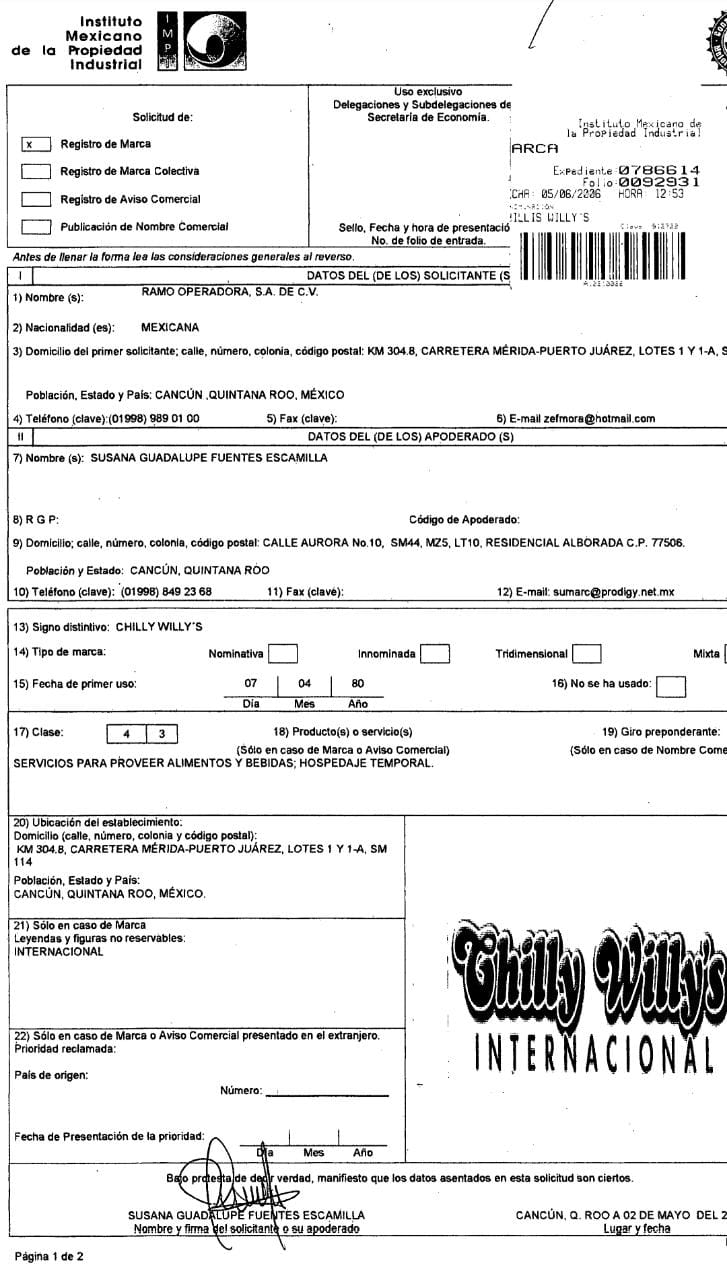 Para empezar hablemos de la marca Chilly Willy’s. Según el trámite hecho ante el Instituto Mexicano de la Propiedad Industrial (IMPI), la primera vez que se usó la marca fue el 7 de abril de 1980. Decían que la marca sería para un servicio para proveer alimentos y bebidas así como hospedaje temporal.
