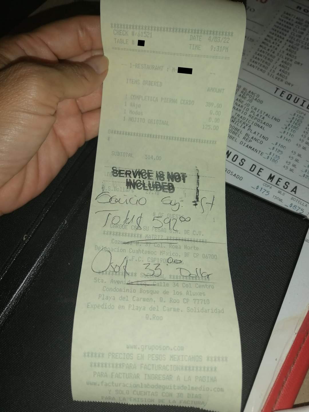 La persona agraviada relató que inclusive preguntó que sí podía dejar menos propina, a lo que el mesero le contestó que no, que se tenía que dejar lo que estaba marcado en el ticket, es decir, el 15% de propina.