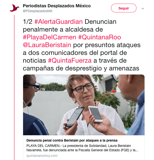 1/2 #AlertaGuardian Denuncian penalmente a alcaldesa de #PlayaDelCarmen #QuintanaRoo @LauraBeristain por presuntos ataques a dos comunicadores del portal de noticias #QuintaFuerza a través de campañas de desprestigio y amenazas https://t.co/YrZ0FtkFjj